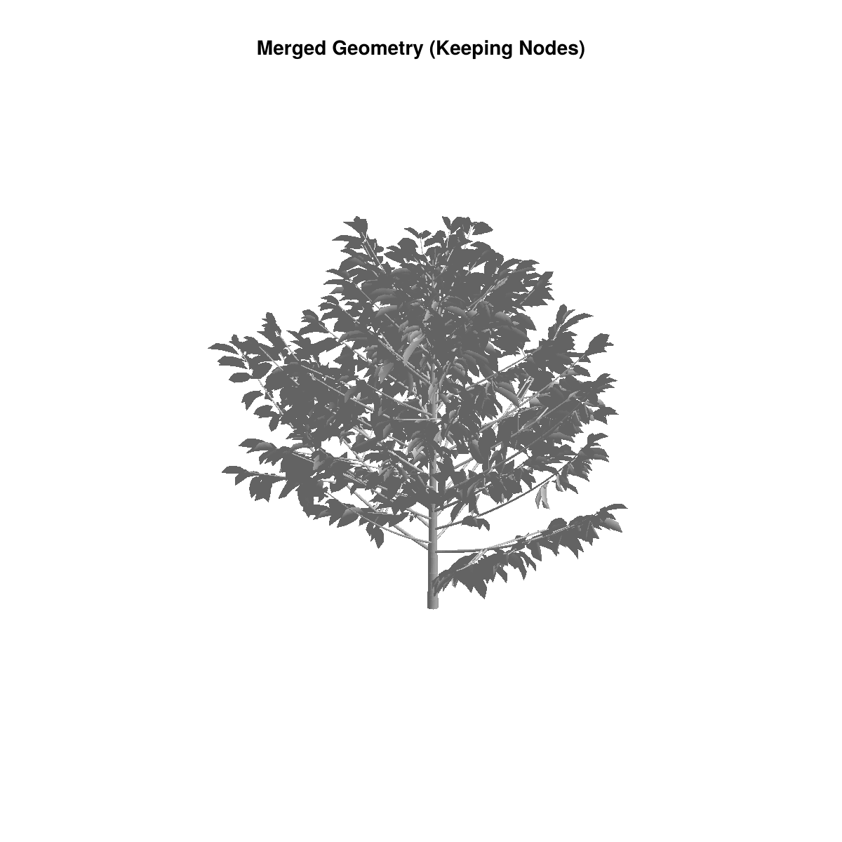 PlantGeom provides tools to merge fine-scale geometries into coarser representations while preserving the complete geometric detail. Note: the PlantViz plotting recipe renders using a single merged mesh by default for performance; the utilities in this page are about structurally merging geometry across MTG scales.