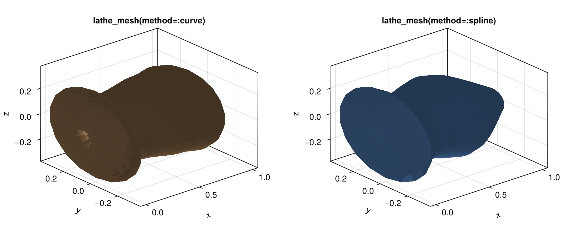 ax2 = Axis3(fig[1, 2], title="lathe_mesh(method=:spline)")
