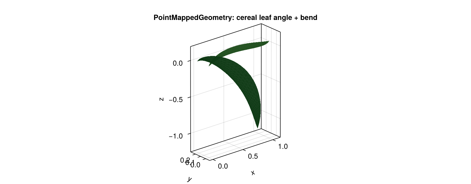 RationalBezierCurve: NURBS-like weighted Bezier midriblamina_midrib: convenience weighted curve builderLaminaMidribMap: point map that wraps a flat lamina around a midribLaminaTwistRollMap: local lamina torsion and edge-roll mapLaminaAnticlasticWaveMap: anticlastic margin map (one side up, the other down)BiomechanicalBendingTransform: cantilever-style organ bending from Young's moduluscompose_point_maps: compose multiple point maps into onelamina_mesh/lamina_refmesh: reusable flat blade reference mesh
