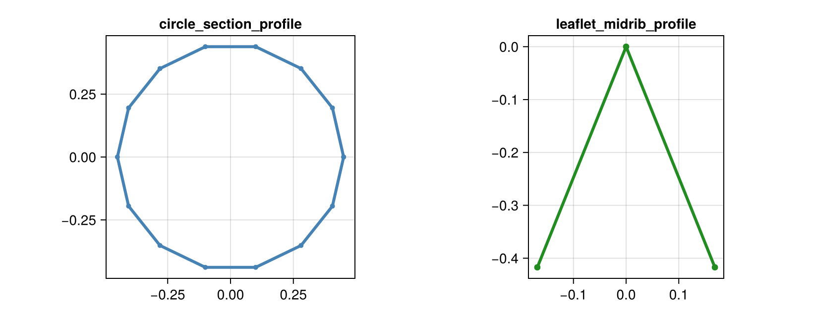 circle_section_profile(n_sides; radius, close_loop=true): circular section points.leaflet_midrib_profile(; lamina_angle_deg, scale): open V-shaped leaflet section.