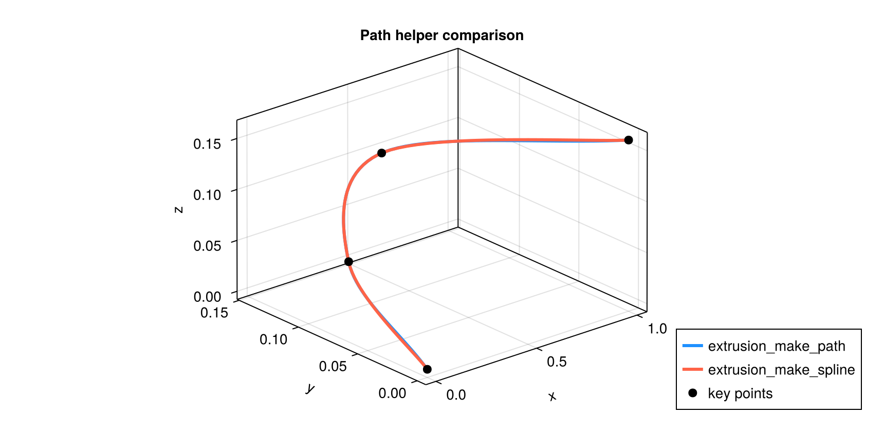 extrusion_make_path(n, key_points; key_tangents=nothing): Hermite-style interpolation.extrusion_make_spline(n, key_points): Catmull-Rom spline interpolation.