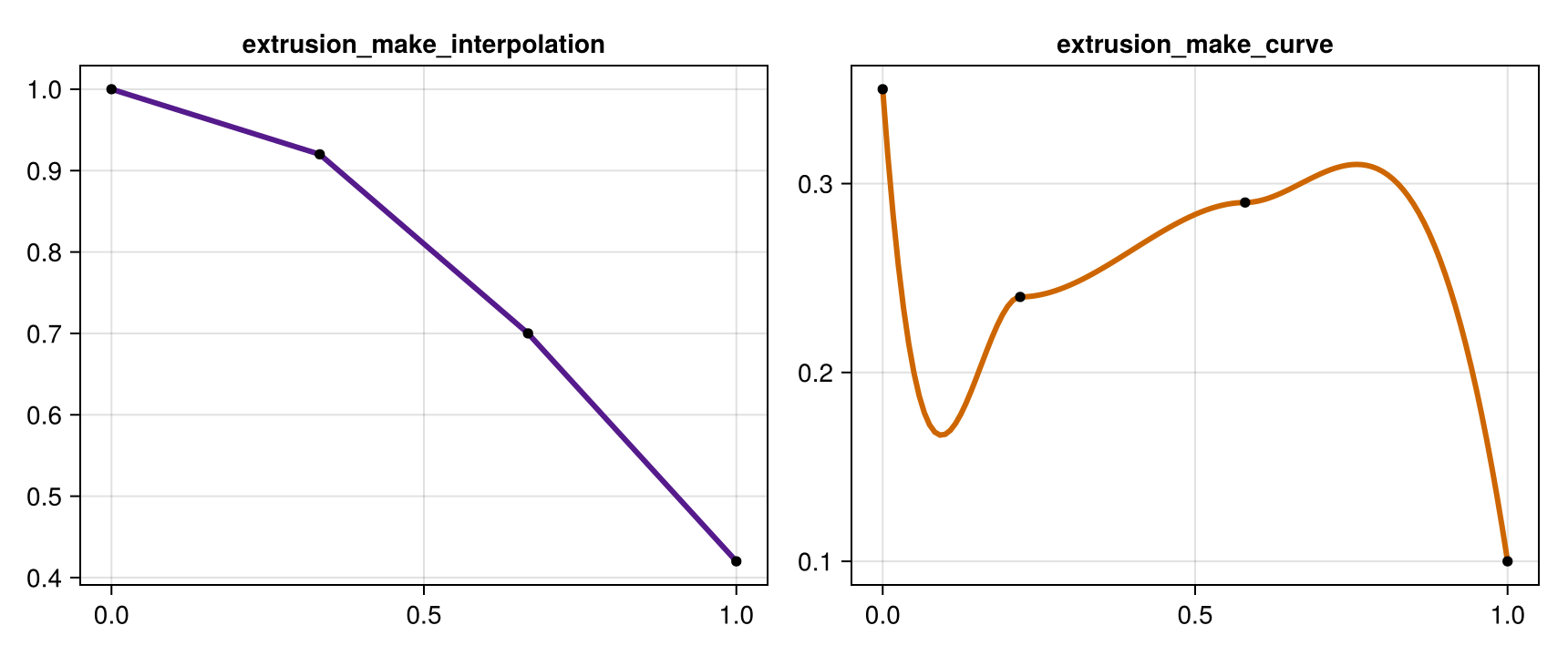 extrusion_make_interpolation(n, key_values): linear interpolation of key scalar values.extrusion_make_curve(z_keys, r_keys, n): AMAP-like extrema-preserving curve sampling.