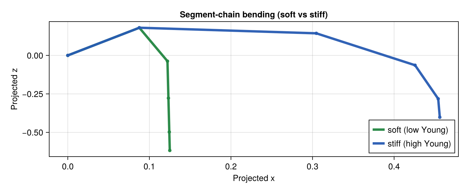 ax = Axis(fig[1, 1], xlabel="Projected x", ylabel="Projected z", title="Segment-chain bending (soft vs stiff)")